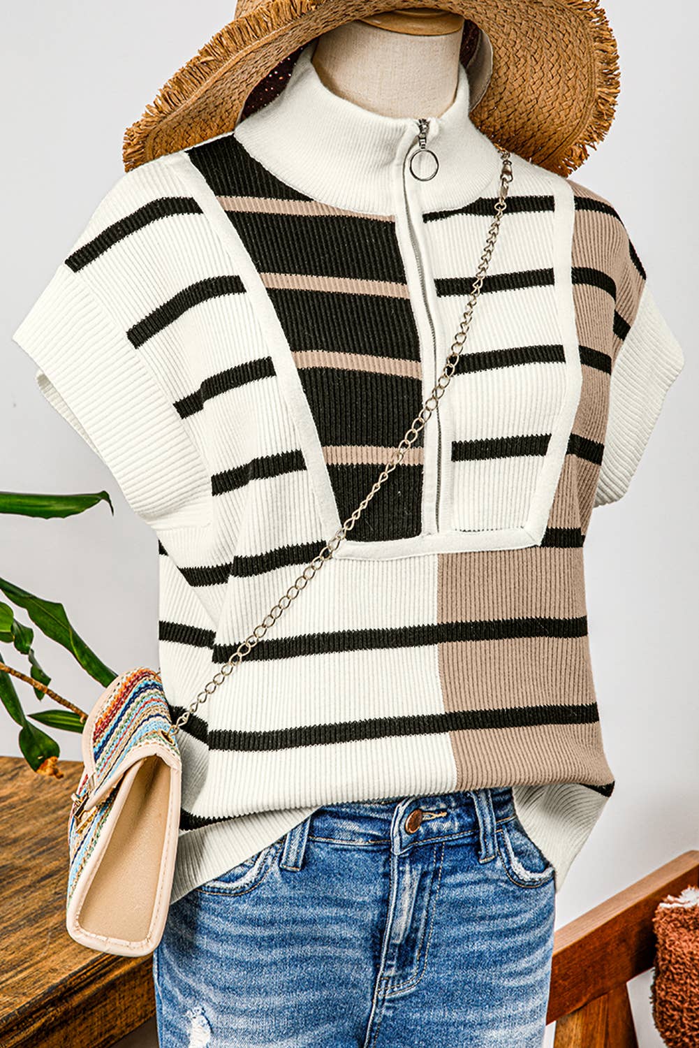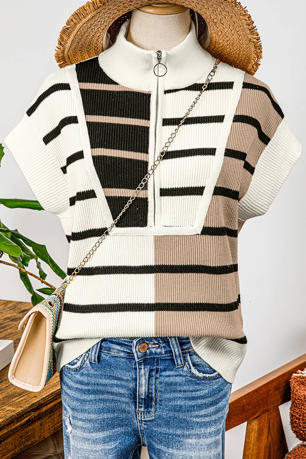 Fashion-W Stripe Colorblock Quarter Zip Collar Sweater Vest